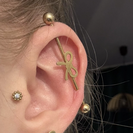 Mały, delikatny, bardzo ładnie wygląda w tragusie, helixie i lobe, jednak długość 8mm za długa do mojego tragusa