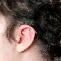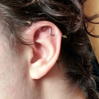 kolczyk wygląda bardzo spoko, nakrętki trzymają się mocno, natomiast w zależności od kąta przekłucia industriala, kształt może trochę irytować ucho