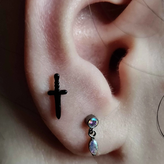 Ciemna opalizująca cyrkonia o szlifie markizowym zawieszona na krótkim łańcuszku. Pięknie ozdobi wiele przekłuć, dodając dynamiki Twojej stylizacji. Polecamy jako klasyczną ozdobę płatka ucha lub do przekłuć typu helix i flat. Montaż jest bardzo prosty – nakrętka posiada cienki drucik, który należy lekko wygiąć, a następnie wcisnąć do pręcika typu push-in wcześniej umieszczonego w kanale przekłucia. Pręciki kompatybilne z tym systemem dostępne są osobno w naszym sklepie, np. PRT11. Wymiary ozdoby: 10 x 3 mm. Cena dotyczy jednej sztuki.